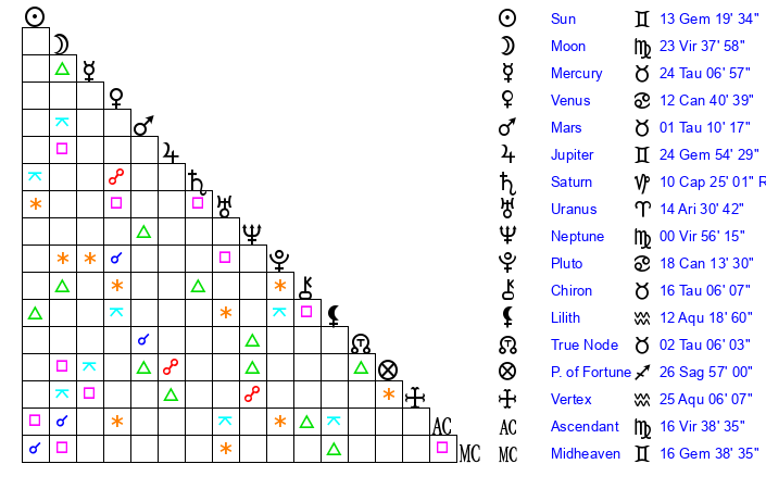 | Sun | 13 Gemini 20 | 14 Gemini 19 | 14 Virgo 20 |