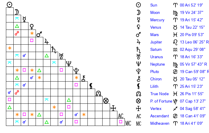 | Mercury | 19 Aries 16 | 6 Aries 59 | 12 Cancer 7 |