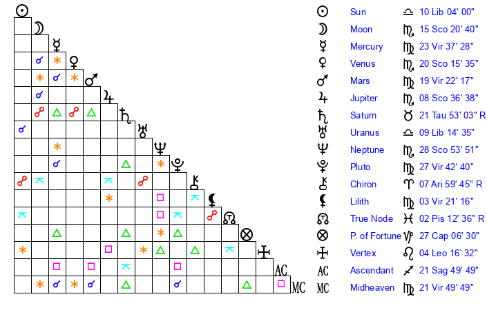 | Venus | 20 Scorpio 15 | 17 Virgo 24 | 9 Scorpio 59 |
