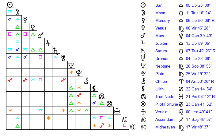 | Moon | 11 Taurus 18 | 21 Sagittarius 31 | 27 Taurus 50 |
