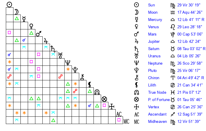 | Pluto | 25 Virgo 6 | 1 Aquarius 27 | 26 Virgo 53 |