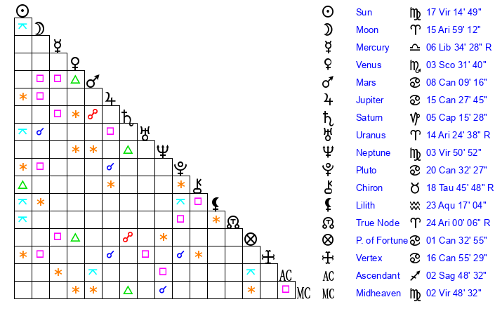 | Neptune | 3 Virgo 51 | 1 Aries 5 | 5 Virgo 47 |