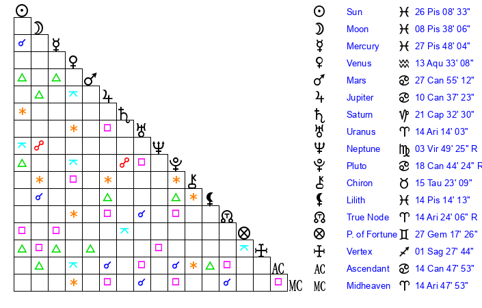 | Pluto | 18 Cancer 44 | 3 Aquarius 17 | 19 Cancer 48 |