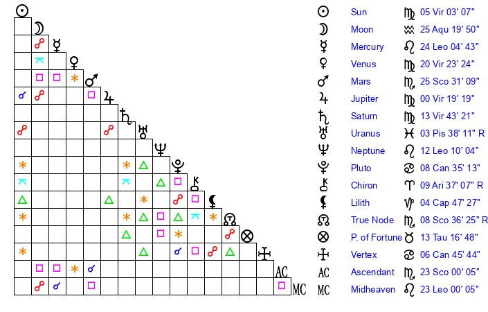 | Mercury | 24 Leo 5 | 21 Leo 4 | 0 Sagittarius 42 |