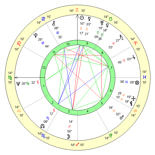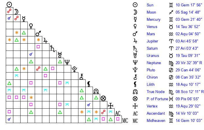 | Sun | 10 Gemini 17 | 11 Gemini 27 | 2 Virgo 33 |