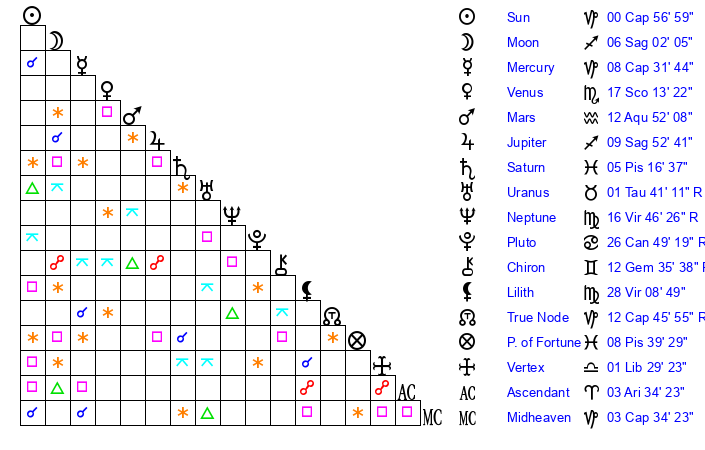 | Sun | 0 Capricorn 56 | 2 Capricorn 22 | 0 Aries 54 |