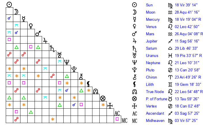 | Sun | 18 Virgo 39 | 19 Virgo 12 | 29 Sagittarius 35 |