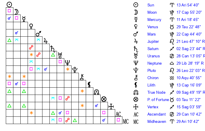 | Sun | 13 Aries 54 | 14 Aries 11 | 20 Gemini 43 |