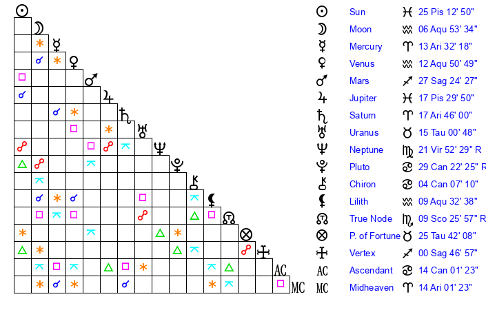 | Saturn | 17 Aries 53 | 22 Pisces 33 | 28 Aries 5 |
