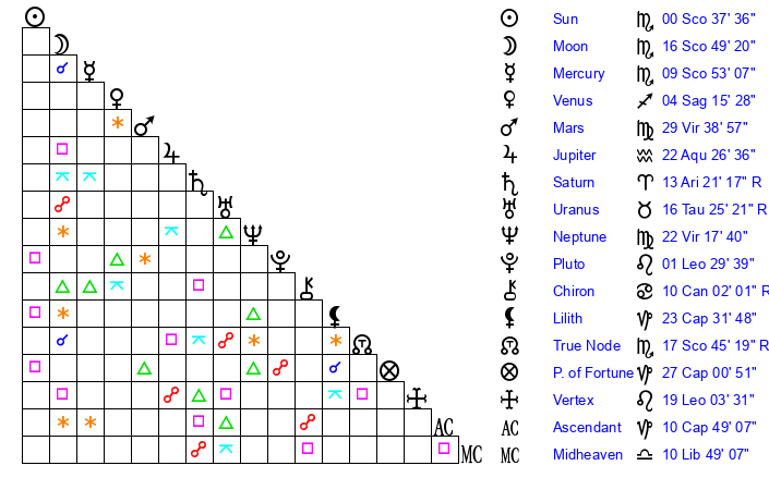 | Sun | 0 Scorpio 37 | 1 Scorpio 32 | 28 Capricorn 44 |
