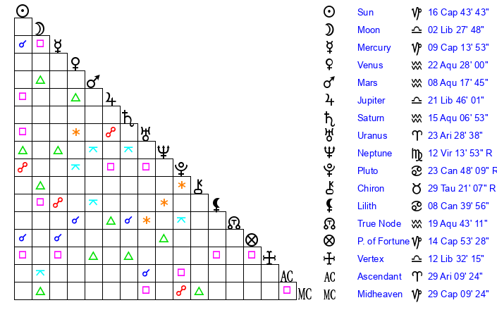 | Moon | 2 Libra 24 | 27 Aries 1 | 10 Aquarius 12 |