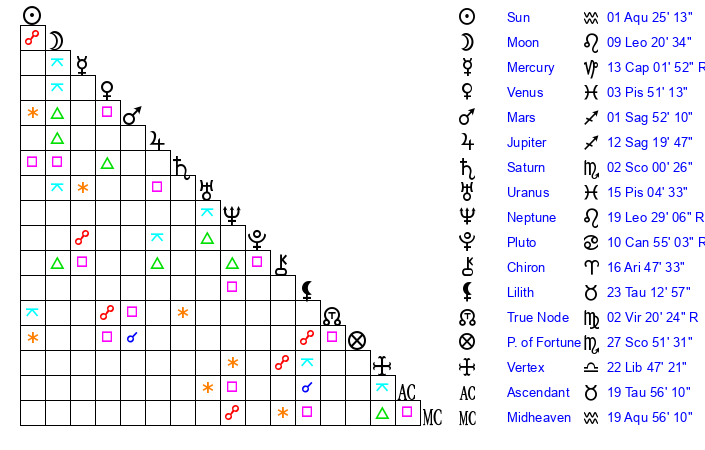 | Sun | 1 Aquarius 25 | 2 Aquarius 56 | 12 Taurus 0 |