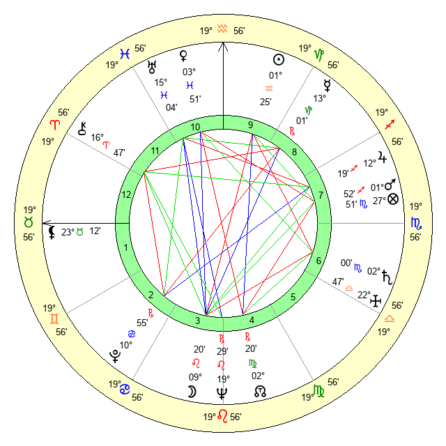 | Moon | 9 Leo 23 | 12 Scorpio 2 | 28 Aries 1 |