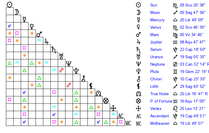 | Mercury | 20 Libra 49 | 3 Sagittarius 49 | 17 Aquarius 38 |