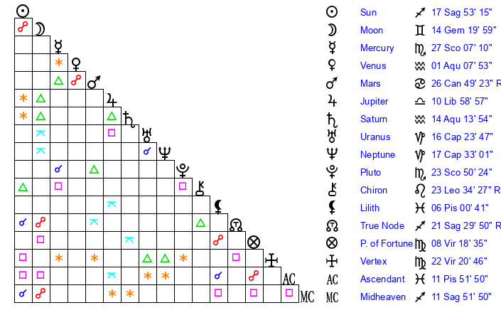 | Sun | 17 Sagittarius 53 | 18 Sagittarius 7 | 20 Capricorn 28 |
