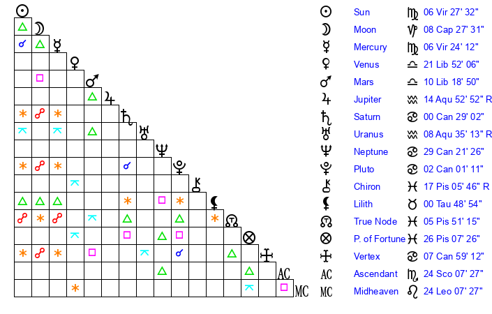 | Sun | 6 Virgo 27 | 7 Virgo 34 | 26 Sagittarius 58 |