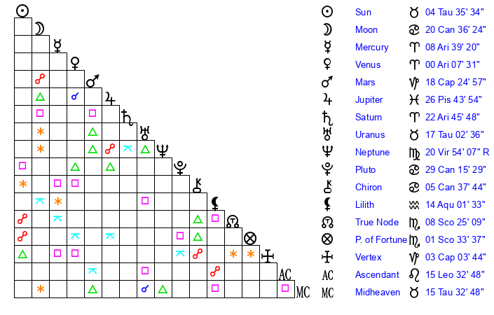 | Moon | 20 Cancer 42 | 6 Aries 0 | 20 Virgo 51 |