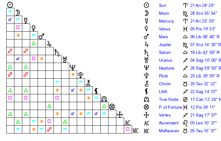 | Saturn | 19 Libra 8 | 25 Pisces 40 | 16 Libra 24 |