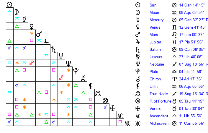 | Jupiter | 17 Pisces 41 | 6 Cancer 7 | 14 Pisces 0 |