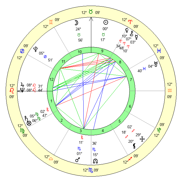 | Moon | 24 Taurus 56 | 26 Capricorn 25 | 24 Pisces 3 |