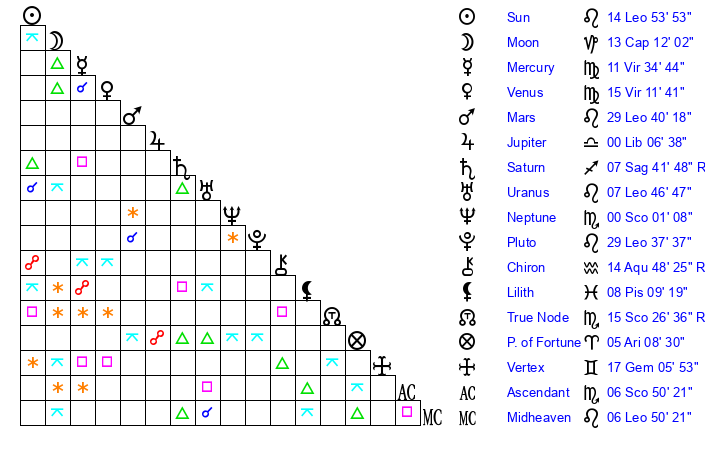 | Pluto | 29 Leo 37 | 2 Aquarius 15 | 1 Virgo 41 |
