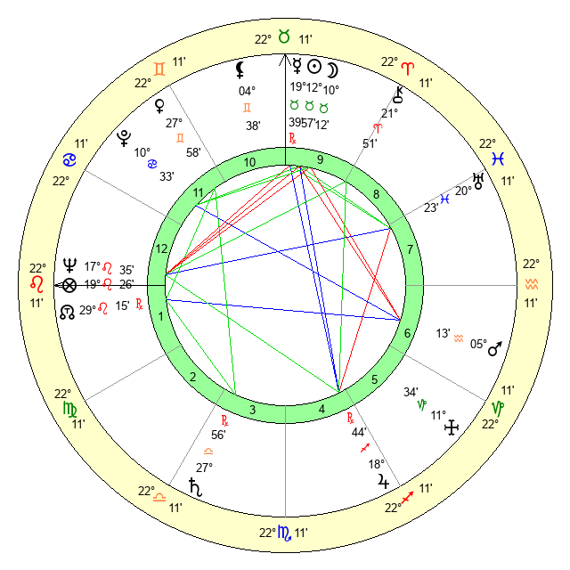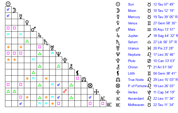 | Sun | 12 Taurus 58 | 13 Taurus 30 | 19 Leo 40 |