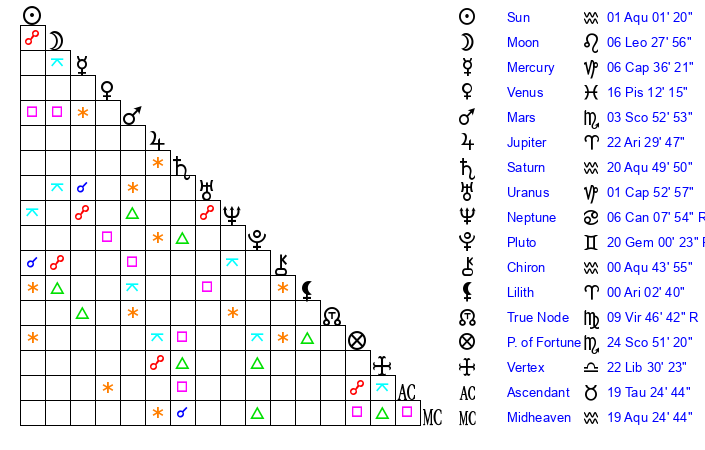 | Saturn | 21 Aquarius 15 | 16 Pisces 17 | 2 Pisces 54 |