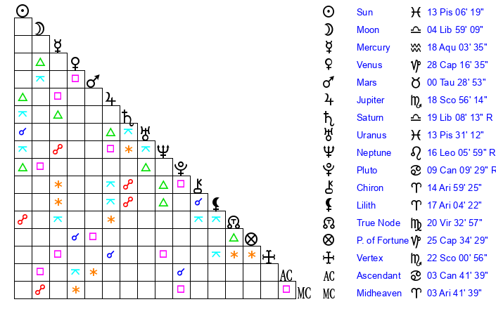 | Saturn | 19 Libra 49 | 21 Pisces 4 | 14 Libra 1 |