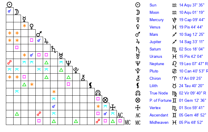 | Sun | 14 Aquarius 37 | 16 Aquarius 8 | 24 Taurus 33 |