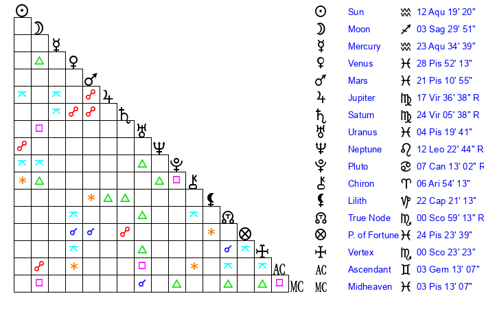 | Neptune | 12 Leo 22 | 27 Pisces 59 | 11 Leo 7 |