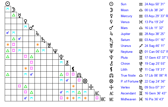 | Sun | 24 Aquarius 51 | 26 Aquarius 15 | 24 Gemini 21 |