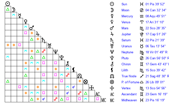 | Saturn | 22 Pisces 28 | 19 Pisces 37 | 2 Aries 31 |