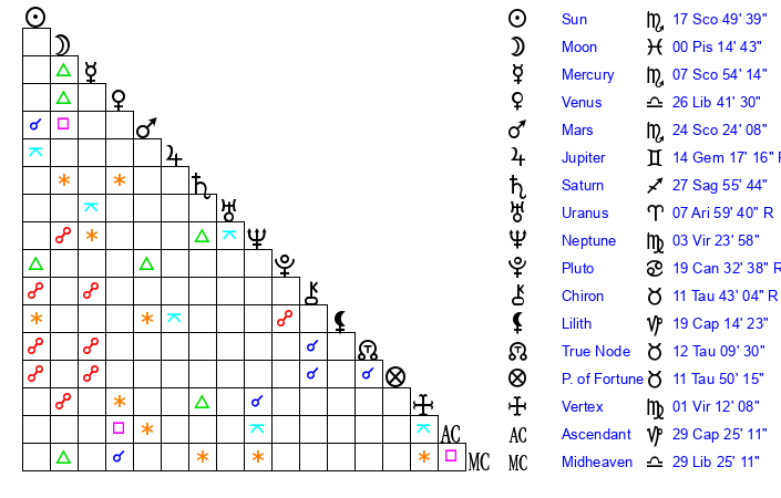 | Sun | 17 Scorpio 49 | 18 Scorpio 33 | 25 Aquarius 18 |