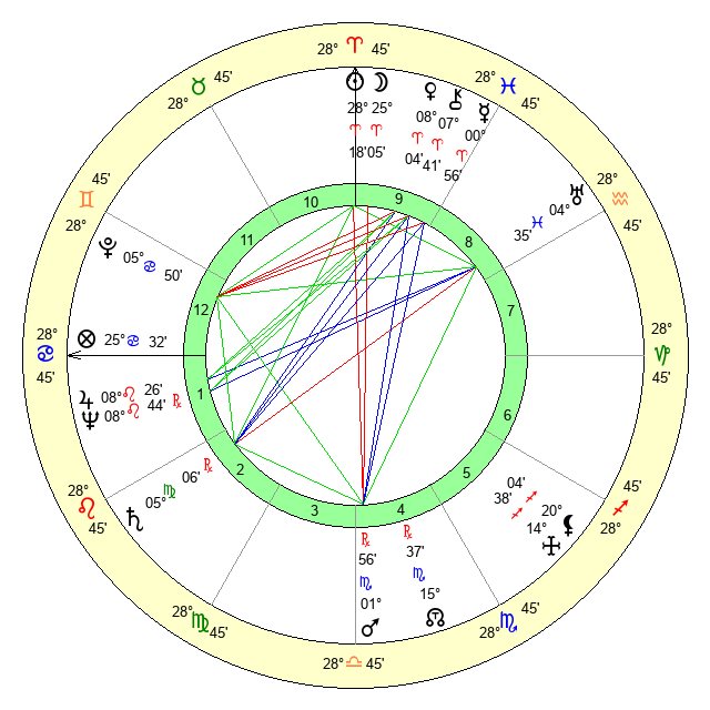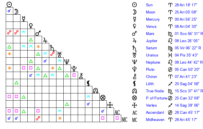 | Sun | 28 Aries 18 | 28 Aries 52 | 9 Leo 3 |