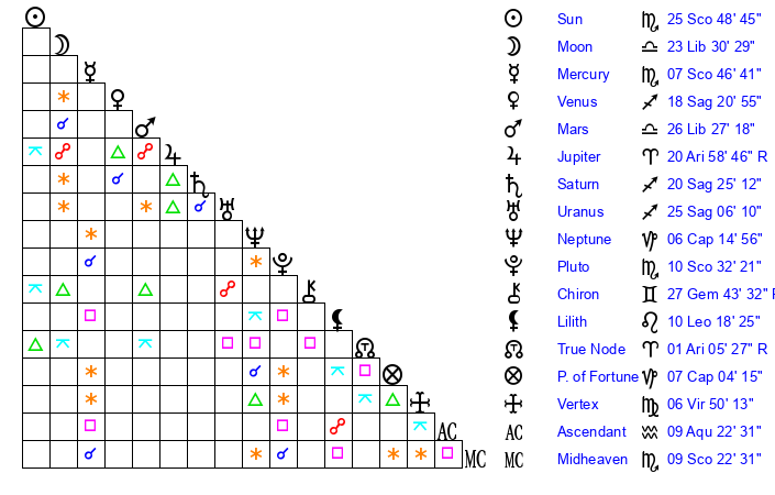 Pluto | 10 Scorpio 32 | 29 Capricorn 58 | 11 Scorpio 49 |