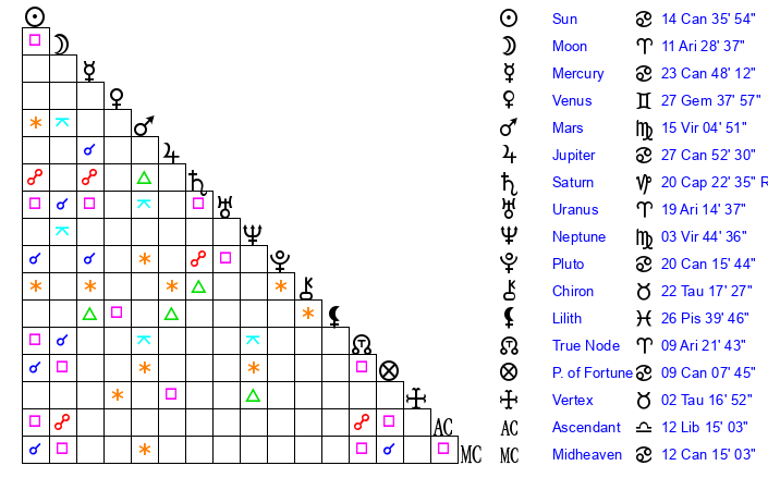 | Sun | 14 Cancer 36 | 15 Cancer 50 | 15 Libra 26 |