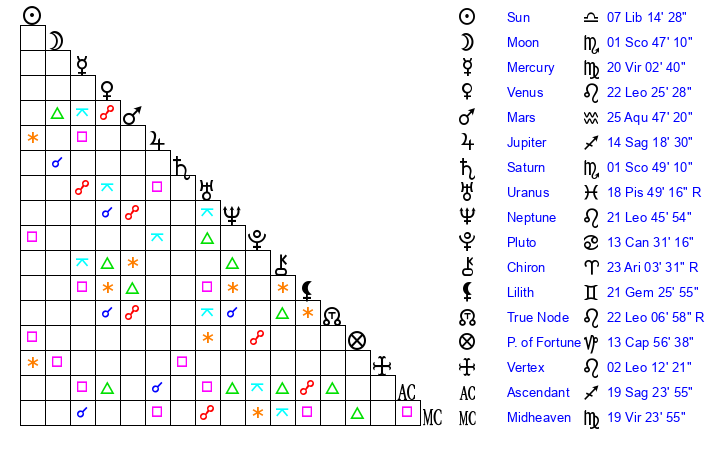 | Saturn | 2 Scorpio 21 | 27 Pisces 40 | 13 Scorpio 15 |