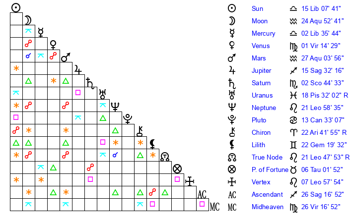 | Moon | 24 Aquarius 49 | 7 Taurus 11 | 23 Libra 40 |
