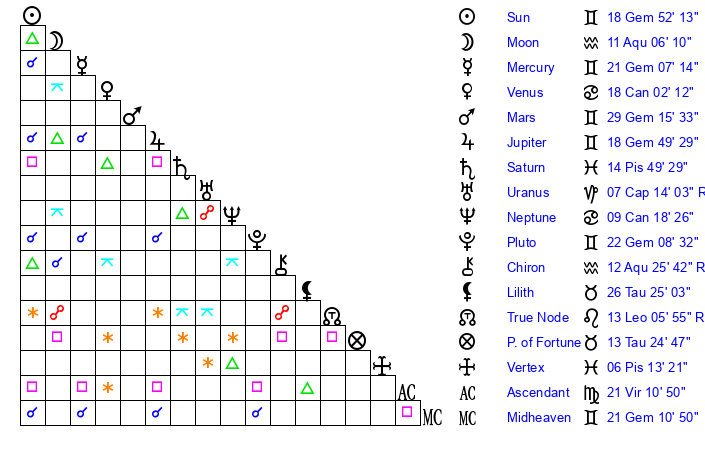 | Moon | 11 Aquarius 6 | 13 Sagittarius 11 | 11 Gemini 31 |