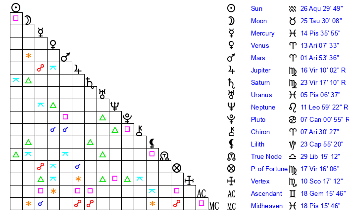 | Mercury | 14 Pisces 35 | 2 Pisces 13 | 29 Gemini 13 |