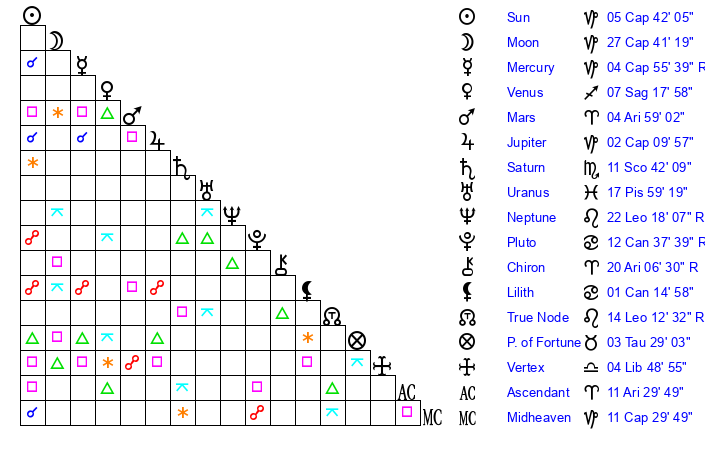 | Moon | 27 Capricorn 33 | 28 Scorpio 31 | 16 Virgo 21 |