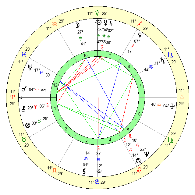 | Mars | 4 Aries 59 | 3 Leo 14 | 8 Gemini 47 |