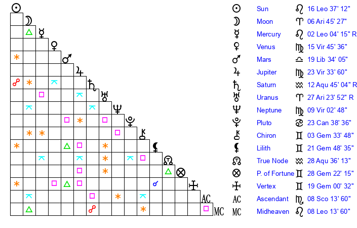 | Moon | 6 Aries 48 | 22 Aquarius 9 | 7 Leo 57 |