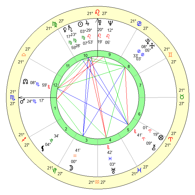 | Venus | 17 Virgo 55 | 1 Leo 13 | 26 Capricorn 39 |