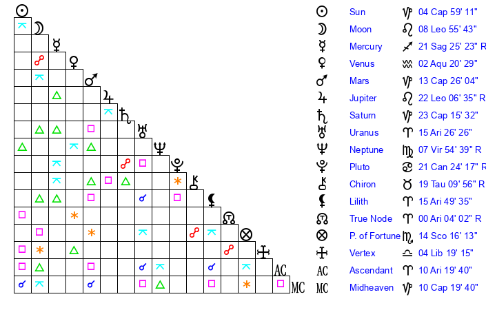 | Sun | 4 Capricorn 59 | 6 Capricorn 26 | 8 Aries 47 |