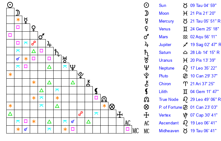 | Sun | 9 Taurus 5 | 9 Taurus 38 | 15 Leo 50 |