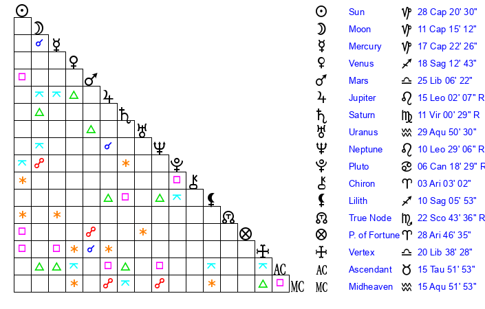 | Moon | 11 Capricorn 15 | 6 Libra 37 | 19 Scorpio 51 |