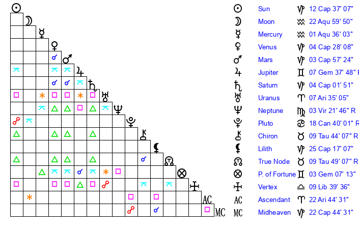 | Saturn | 4 Capricorn 19 | 14 Pisces 40 | 12 Capricorn 1 |