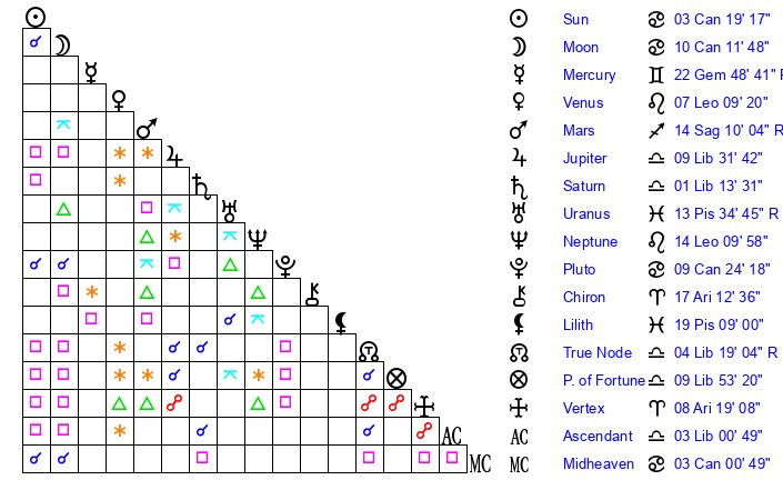 | Moon | 10 Cancer 14 | 8 Cancer 1 | 19 Aries 58 |