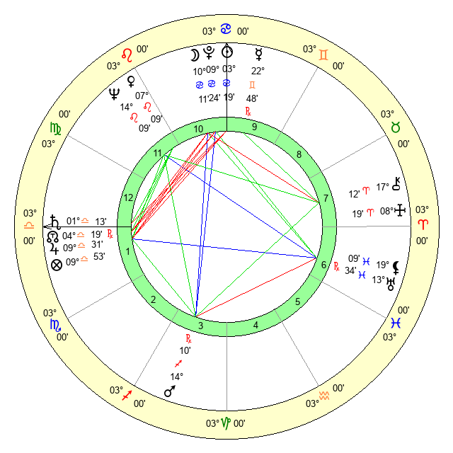 | Sun | 3 Cancer 19 | 4 Cancer 23 | 12 Libra 39 |